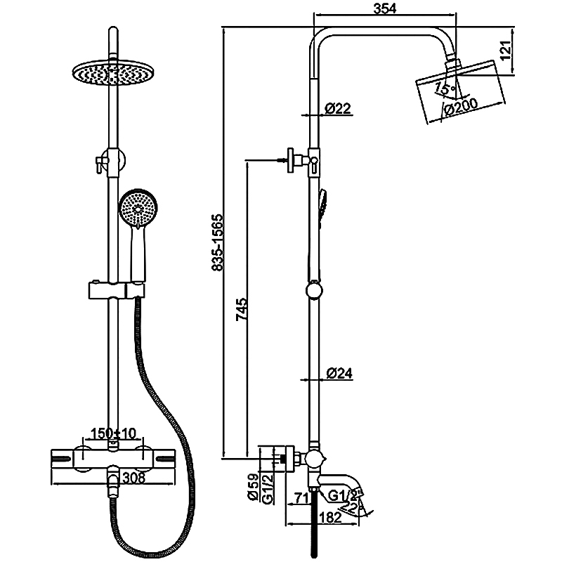 | Комплектация | смеситель, душевая стойка, верхний душ, душевая лейка, душевой шланг, держатель для душевой лейки, настенный держатель, отражатели, эксцентрики |