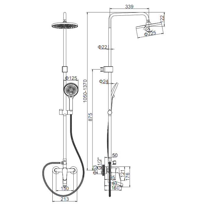 | Комплектация | смеситель, душевая стойка, верхний душ, душевая лейка, душевой шланг, держатель для душевой лейки, настенный держатель, отражатели, эксцентрики |