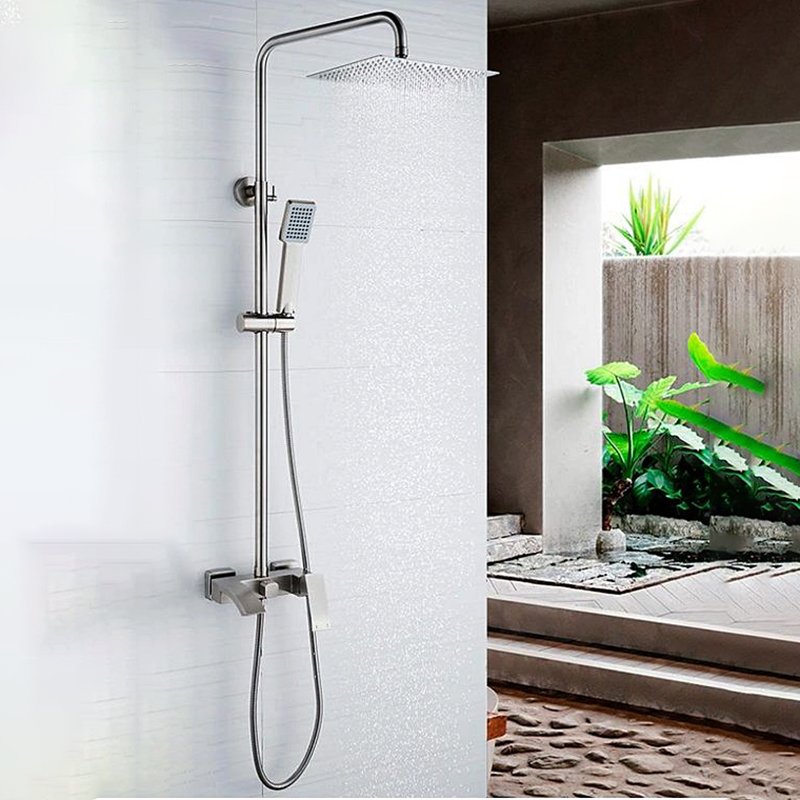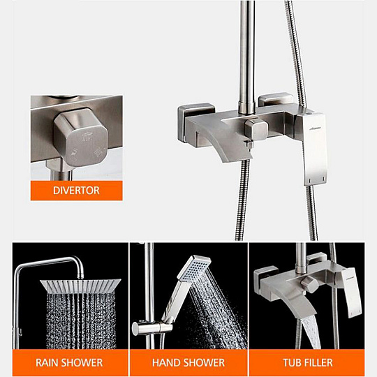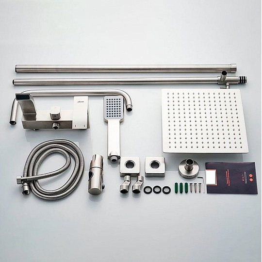 | Комплектация | смеситель, душевая стойка, верхний душ, душевая лейка, душевой шланг, держатель для душевой лейки, настенный держатель, отражатели, эксцентрики |
