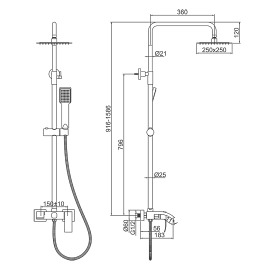 | Комплектация | смеситель, душевая стойка, верхний душ, душевая лейка, душевой шланг, держатель для душевой лейки, настенный держатель, отражатели, эксцентрики |